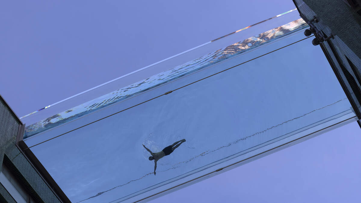 Would you swim in a transparent pool, suspended 115 feet in the air between two high rises? On the plus side, you can see the bottom --