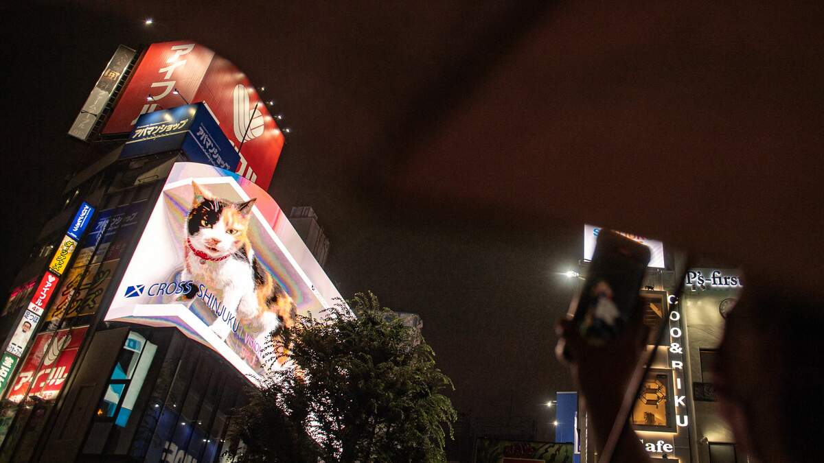 The massive billboard is a 1,664-square-foot curved LED screen on top of a building. The cat is meant to draw attention to the new tech, called Cross Shinjuku Vision.